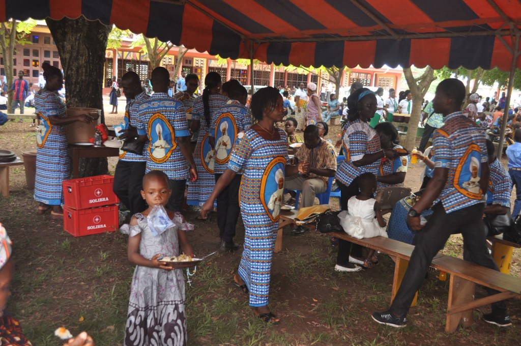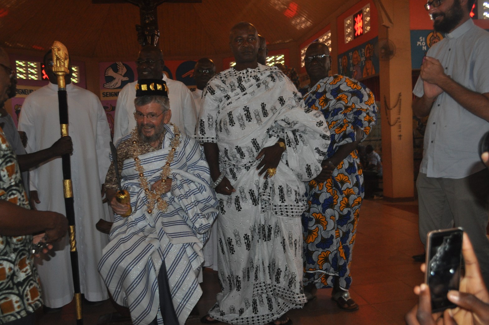 L’affetto sincero degli ivoriani è stato dimostrato dai tanti preti che hanno voluto partecipare alla festa e dai parrocchiani che hanno partecipato con grande entusiasmo: non solo la Chiesa era pienissima, ma anche il cortile si è riempito di gente. Père Cyprien, il vicario locale che ha tenuto l’omelia, ha ricordato la persona umile e semplice di don Gianni. “Don Gianni non ha fatto miracoli, don Gianni non ha compiuto gesti particolari, ma per 36 anni ha fatto crescere la fede nella regione degli Agni Djuablin, dove si sono moltiplicati i cristiani e le vocazioni” e questo vale più di ogni miracolo. Alla fine della Messa, alla presenza del nuovo re di Agnibilekrou, don Gianni è stato vestito alla maniera dei capi africani con tanto di copricapo, scettro e la spada reale. Vestito in questa maniera e un po’ impacciato a causa di tutto questo abbigliamento ingombrante è stato accolto dall’entusiasmo di tutta la gente, contentissima di vederlo incoronato e vestito come un re. “E’ a causa di Gesù tutto questo, è a causa dei poveri tutto questo”.