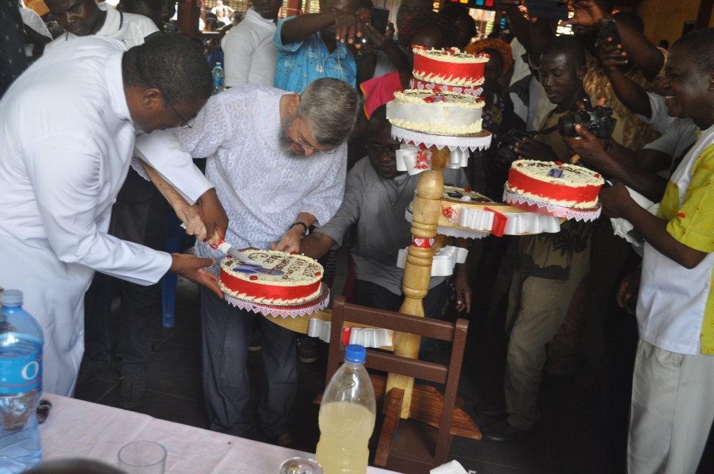 E allora non poteva esserci giorno migliore per festeggiare don Gianni che la giornata missionaria mondiale, ricordando il suo impegno per annunciare il Vangelo in ogni luogo, in ogni situazione. E allora non poteva esserci giorno migliore per festeggiare don Gianni che l’apertura di un anno pastorale, lui che è stato pastore in inimmaginabili situazioni, lui che si è speso per la formazione umana e cristiana di migliaia di ivoriani, lui che anche quest’anno, sebbene affaticato ed anziano, ha scelto di continuare il suo servizio di parroco, in fondo anche per accompagnare e sostenere i primi goffi passi di me e don Marco in terra ivoriana. “E’ a causa di Gesù tutto questo, è a causa dei poveri tutto questo”.