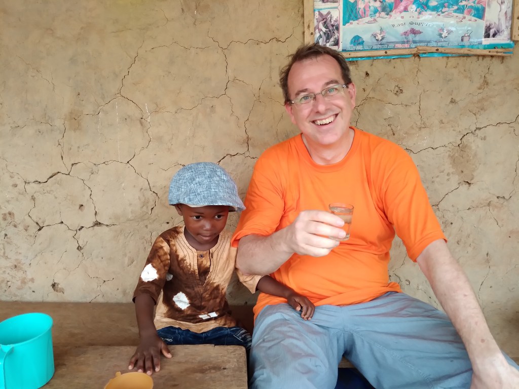 Don Sergio alla casa del piccolo Luc, con un bel bicchiere di grappa ivoriana