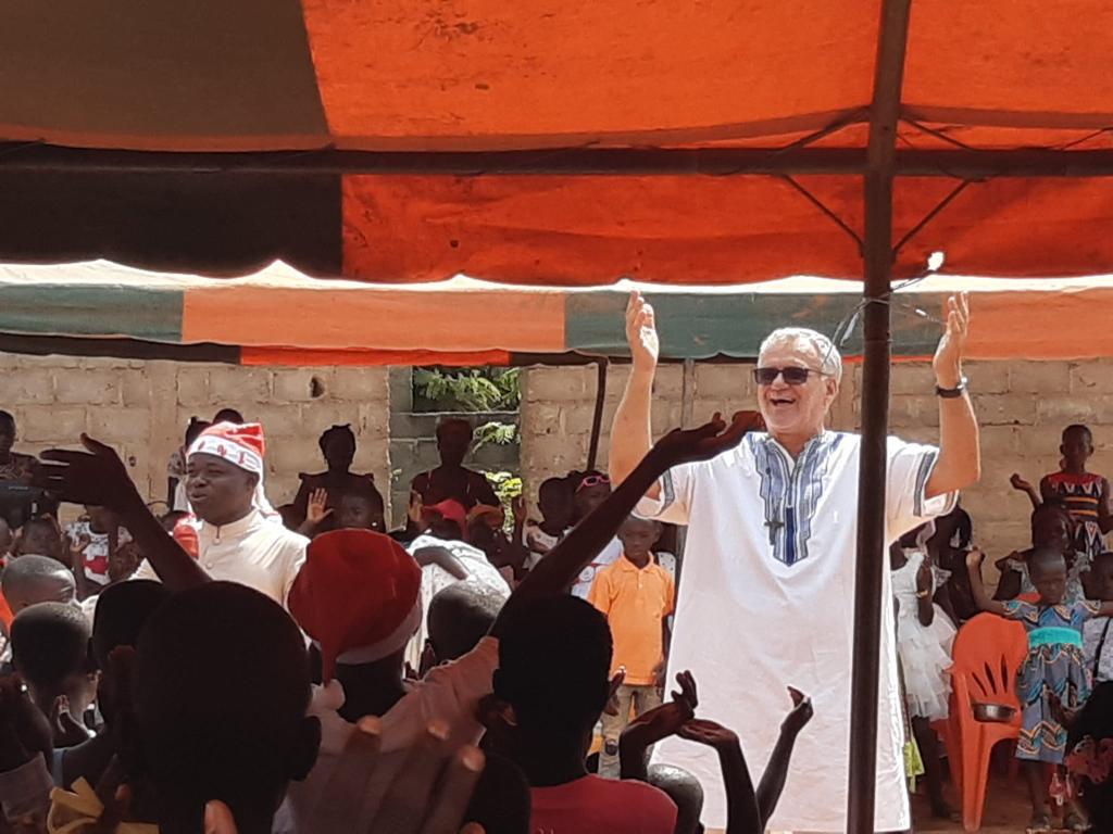 La prima volta che vidi don Elvio lo paragonai subito ad un elefante. Era il gennaio 2018 e vivevo il mio primo viaggio missionario in Africa con il nuovo anno pastorale sarei venuto ad abitare ad Agnibilekrou. Don Elvio non era nella grande città, ma in un villaggio sperduto, N’Dakro: qualche casa in mezzo alla savana polverosa, dove si stava impegnando a costruire la canonica e a sistemare la Chiesa. Tutto il villaggio si era radunato per accogliere gli ospiti bergamaschi non mancava la banda, il comitato della Chiesa, i capi del villaggio, tutti guidati da questo omone imponente che ci presentò la sua realtà con il suo tipico entusiasmo da bambino.