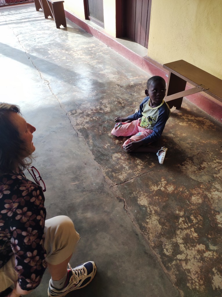 Nel pomeriggio trovo una comitiva di persone alla terrazza intente a parlare con Walter. Intanto Lucia e Elena, altra giovane volontaria arrivata da pochi giorni con Lucia, stanno attorno ad un bambino che è accasciato per terra. Mentre arrivo mi guarda con un po’ di sospetto, poi Lucia gonfia un palloncino e lo lascia andare, il bimbo segue con gli occhi il percorso frenetico e io imito il suo della pernacchia dell’aria che esce… e il piccolino si scioglie e comincia a ridere di gusto… Non parla, ma i parenti ci dicono che si chiama Baba e che ha sette anni, ma non ha mai camminato, però si sposta sulle ginocchia e si sostiene bene e sarebbe davvero bello se imparasse a camminare. La famiglia si accorda con Walter per una visita al centro di fisioterapia.