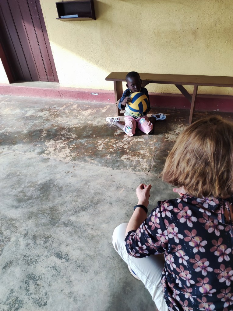 Nel frattempo porto un pallone e anche il piccolo Baba si diverte un mondo anche se non sempre riesce ad afferrare la palla con le braccia tanto scoordinate, ma dopo un po’ capiamo che ama molto prendere la palla con la testa e ogni volta è un sorriso meraviglioso che si dipinge sul suo volto. Ed in fondo mi basta questa giornata per ridirmi che, nonostante le fatiche, non manca tanta misteriosa bellezza che si nasconde nelle pieghe della vita, spesso proprio dove si pensava non ci fosse più speranza… ma a volte basta solo un pallone ed il sorriso di un bambino e gli occhi di qualche persona originale, come Lucia, che ti fanno vedere le cose da una nuova prospettiva.