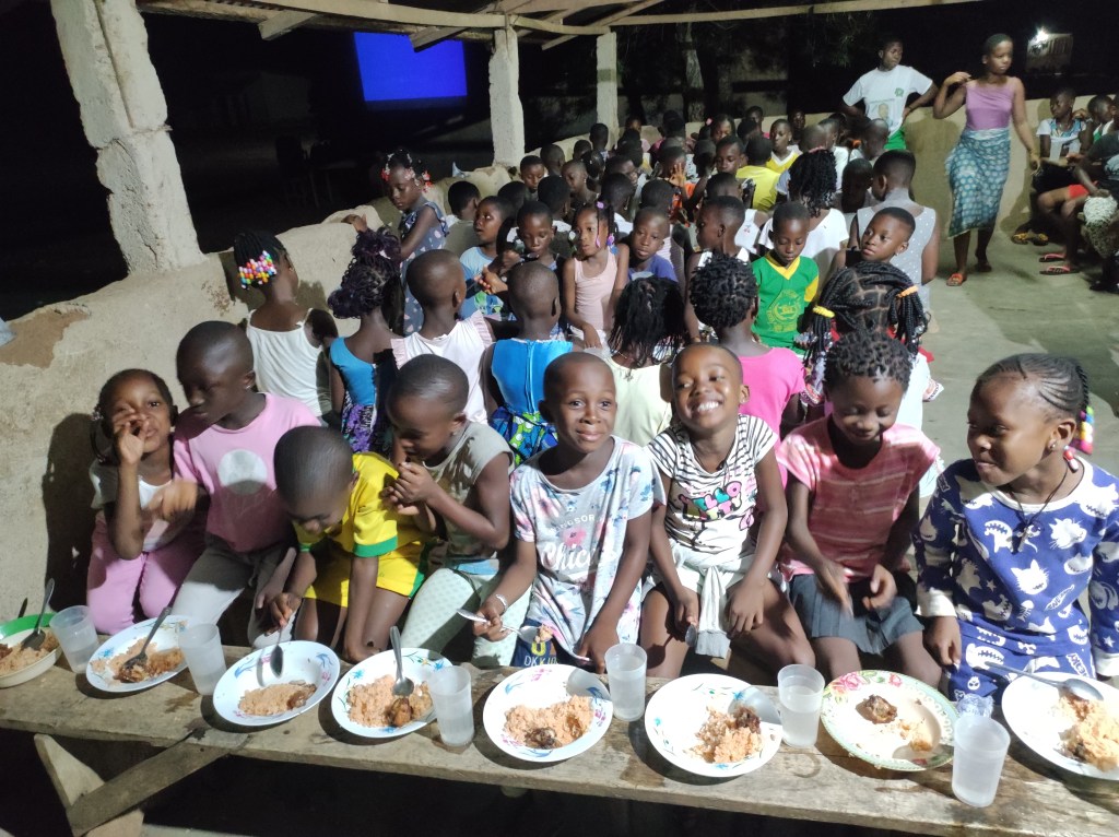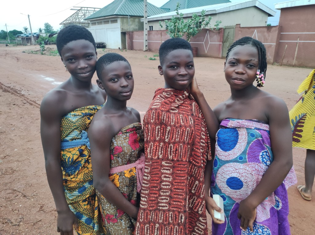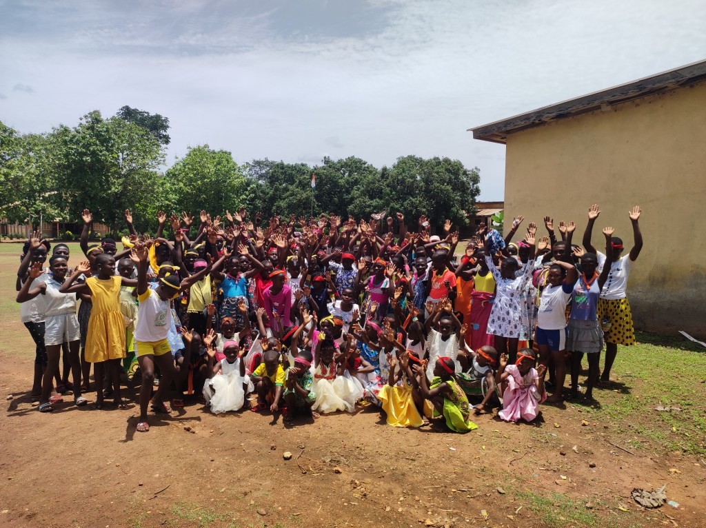 Ma non solo i CV-AV, anche le Anges, ovvero le bimbe che danzano in Chiesa, hanno deciso di vivere un campo di formazione approfittando delle vacanze scolastiche, a Bangoua, il villaggio più lontano della nostra parrocchia. Decido di partire con loro e di accompagnarle in questa avventura e mi ritrovo attorniato da 140 donne! Milly, la loro responsabile, un donnone che fa paura solo a guardarla le tiene d’occhio con pugno di ferro e tenerezza di mamma, accanto a lei Florence con i suoi modi gentili, la dolcezza e la serietà di una ragazza splendida… Poi ci sono le Yaya, così si chiama il gruppo delle danzatrici adolescenti, sono loro che si preoccupano di aiutare Milly in tutte le incombenze pratiche: lavare i piatti, servire il cibo, accudire le più piccole. Come tutte le adolescenti esprimono in mille segni il loro desiderio di ribellione e il loro bisogno di riconoscimento ed amore. E poi una moltitudine di bambine, molte vengono dalla città, ma circa 40 vengono dai vari villaggi della parrocchia, ci sono ragazzine, ma anche bambine di 5-6 anni. Un guazzabuglio di donne meraviglioso.