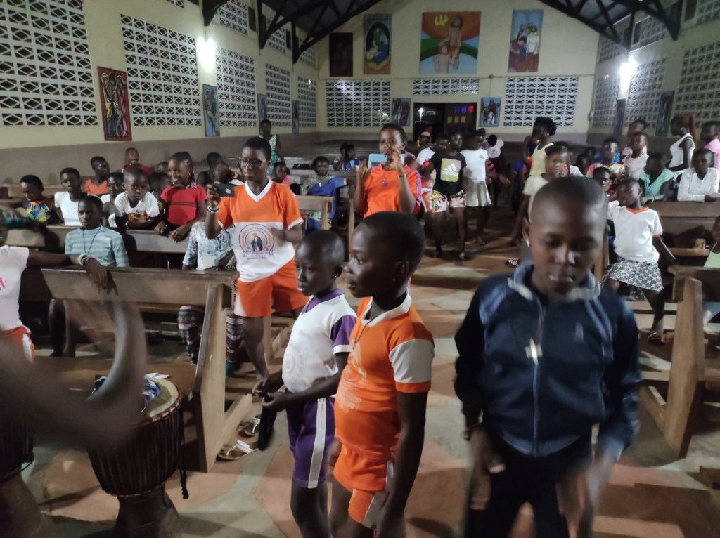 Arrivo a Bangoua per primo e scopro che niente di quello che i catechisti del villaggio avevano promesso è stato preparato: le aule della scuola per accogliere le ragazze sono poche (solo 3 per tutte e 140), sporche e con i banchi all’interno, l’acqua per bere e lavarsi non è stata predisposta, in cucina nessuno sembra pronto a dare una mano alla mamma venuta dalla città. Però il bello dell’Africa è la capacità di adattarsi e nonostante un inizio non semplice tutto si sistema e fila liscio, tra canti, balli, giochi… la seconda sera la Chiesa di Bangoua si trasforma in una discoteca per permettere alle ragazze di mostrare ed esibire i balletti che hanno preparato. Loro animano tutto l’anno la Messa danzando a ritmo dei canti sacri, credo che Gesù si sia compiaciuto nel vederle tanto contente del ballare anche i pezzi più commerciali con gioia e partecipazione.
