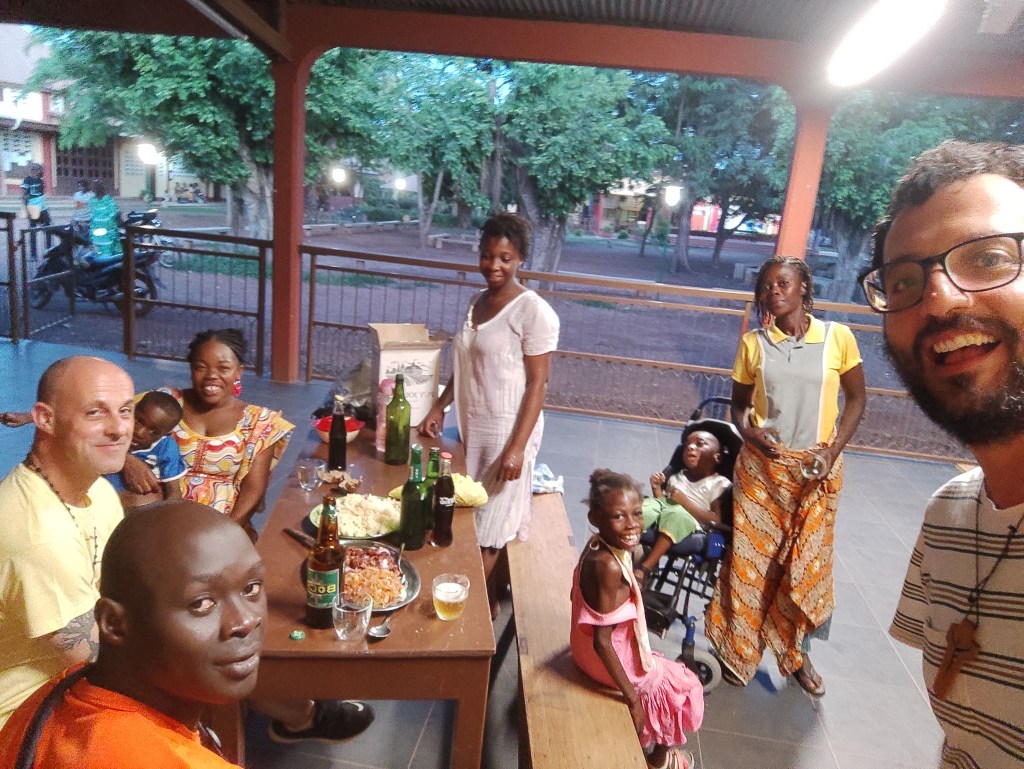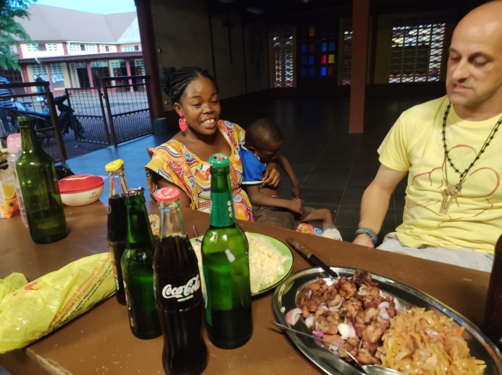 Lo stesso lunedì pomeriggio è il giorno in cui i nostri mitici bimbi disabili vengono per le loro attività con Walter alla parrocchia: Divine, Jean Baptiste e Prince. Le loro mamme hanno saputo del mio anniversario e arrivano con un bel aperitivo: qualche bibita, attieké con cipolle e pollo! E poi, in un cestino a parte, del foutou con la salsa gnagna molto amara che serve per guarire dalla malaria. Mi commuove questa loro attenzione e questa prova d’affetto. Anche perché so che sono donne sole che lottano ogni mese per arrivare a pagare tutto il necessario, ma oggi si sono prese il lusso di festeggiare con me, un brindisi e poi un boccone al volo, ma è il pasto più sontuoso e bello che potessi immaginare.