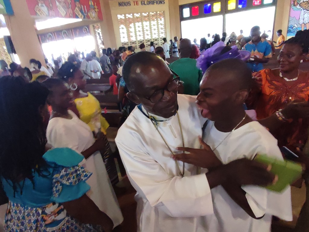 Molti rimangono colpiti da questo evento e come nella tradizione miracolistica africana invocano un intervento divino per la sua guarigione completa. Ma in fondo Koffi mi sembra l’unico sano, una persona serena, vissuto come scarto di una società che non accetta la disabilità, ma di fronte a tutto questo ha sempre risposto con il sorriso e i suoi versi strani. Forse gli unici malati siamo noi, incapaci di prendersi cura di questo ragazzo in difficoltà. Almeno il giorno del suo battesimo è stato al centro dell’attenzione di una comunità, chissà che questo cammino della nostra guarigione possa continuare o se sia solo il fuoco di paglia di una giornata…