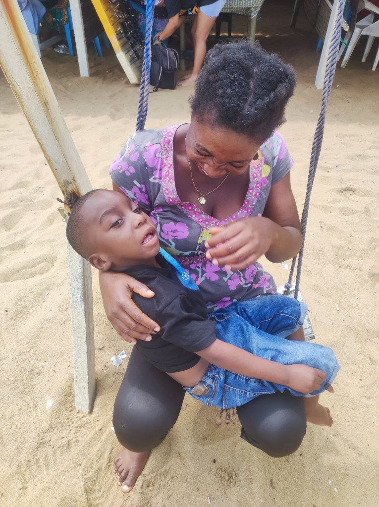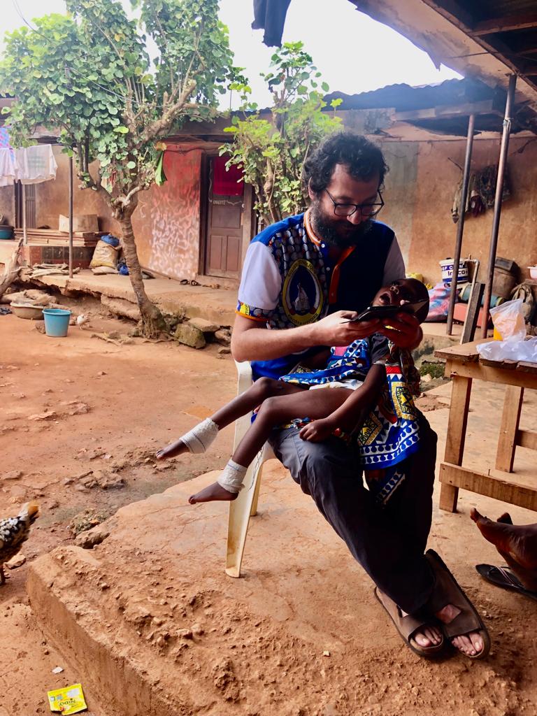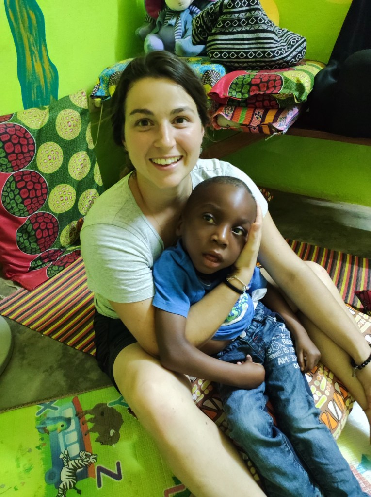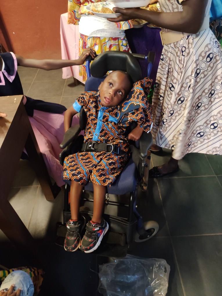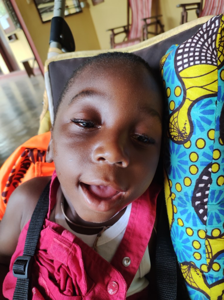 Ricordo ancora quella sera del gennaio 2019, da alcuni giorni avevamo in mano una lista di nomi di bambini disabili da visitare donataci da suor Glwadis. Era pomeriggio inoltrato quando entrammo nel cortile della sua famiglia. Dapprima si trova una bella casetta per il capofamiglia con annesso un piccolo cortile, poi un corridoio stretto e basso che apre su un imprevedibile cortile ampio e disastrato: fili tirati con panni stesi dappertutto, porte che si aprono a intervalli irregolari, gradini scoscesi, padelle abbandonate, galline che ruzzolano, donne in procinto di fare la doccia e bambini ovunque. In quel cortile ho conosciuto Jean Baptiste. Era là in braccio alla sua mamma Teya con la testa a ciondoloni e la bocca immancabilmente spalancata. Era bello con un bambolotto e dopo poco chiesi alla mamma: “posso prenderlo in braccio?” e fu amore a prima vista. La mamma aveva uno sguardo triste e sconsolato di chi sta portando un peso più grande di lei senza alcun sostegno, attorno gli sguardi attoniti di fronte a questa invasione di bianchi che visitano un bimbo senza speranza.