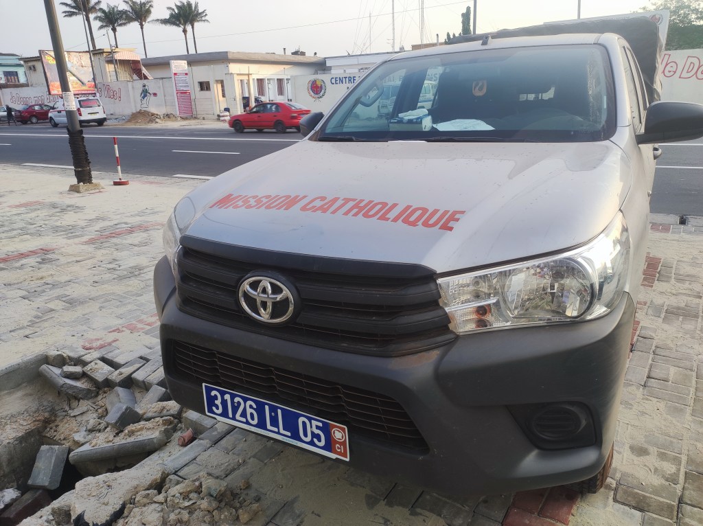 Mi reco ad Abidjan da solo con la nuova macchina, un bel pick-up Toyota che è comodo sia nelle strade asfaltate, ma che ci potrà condurre anche nelle strade più accidentate dei villaggi. E ci vado proprio a causa della macchina: dopo tre mesi è finalmente arrivata la targa. Perché effettivamente la targa non arriva insieme alla macchina, ma viene posta solo un’etichetta con una targa provvisoria in attesa di non si sa quali pratiche, così la targa che doveva essere pronta a fine dicembre è pronta solo a fine gennaio e non è possibile inviarla altrove, è necessario rendersi ad Abidjan per sistemarla.