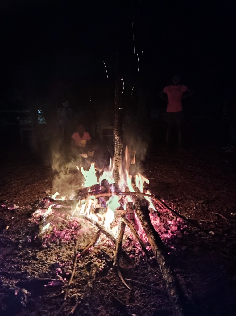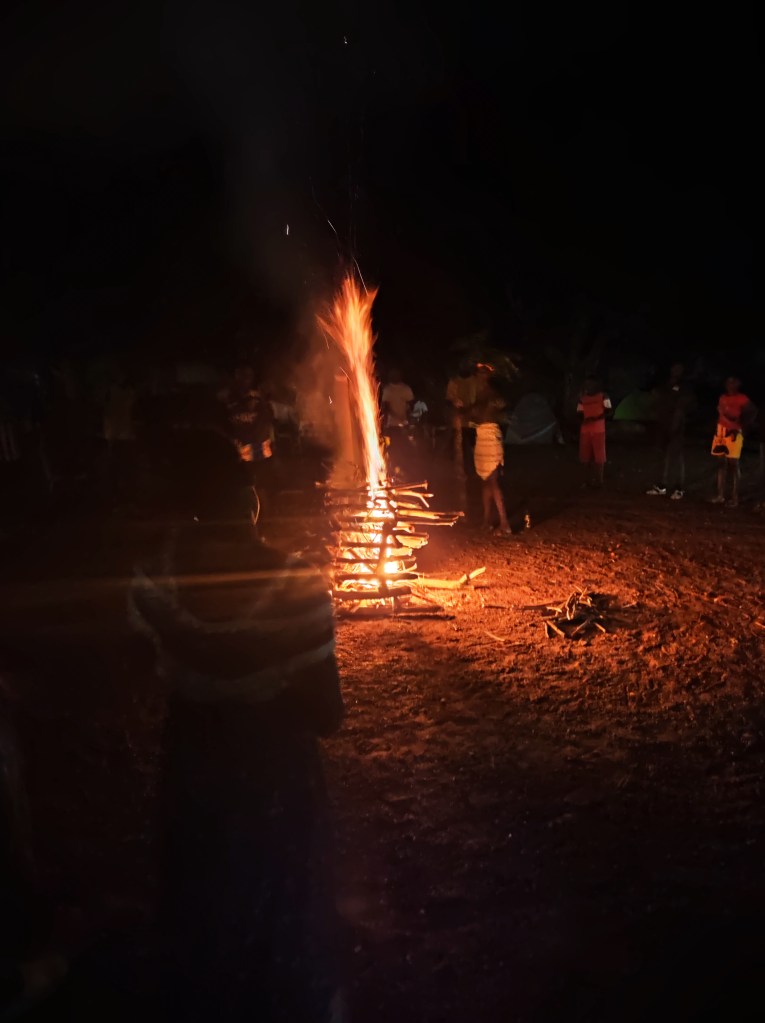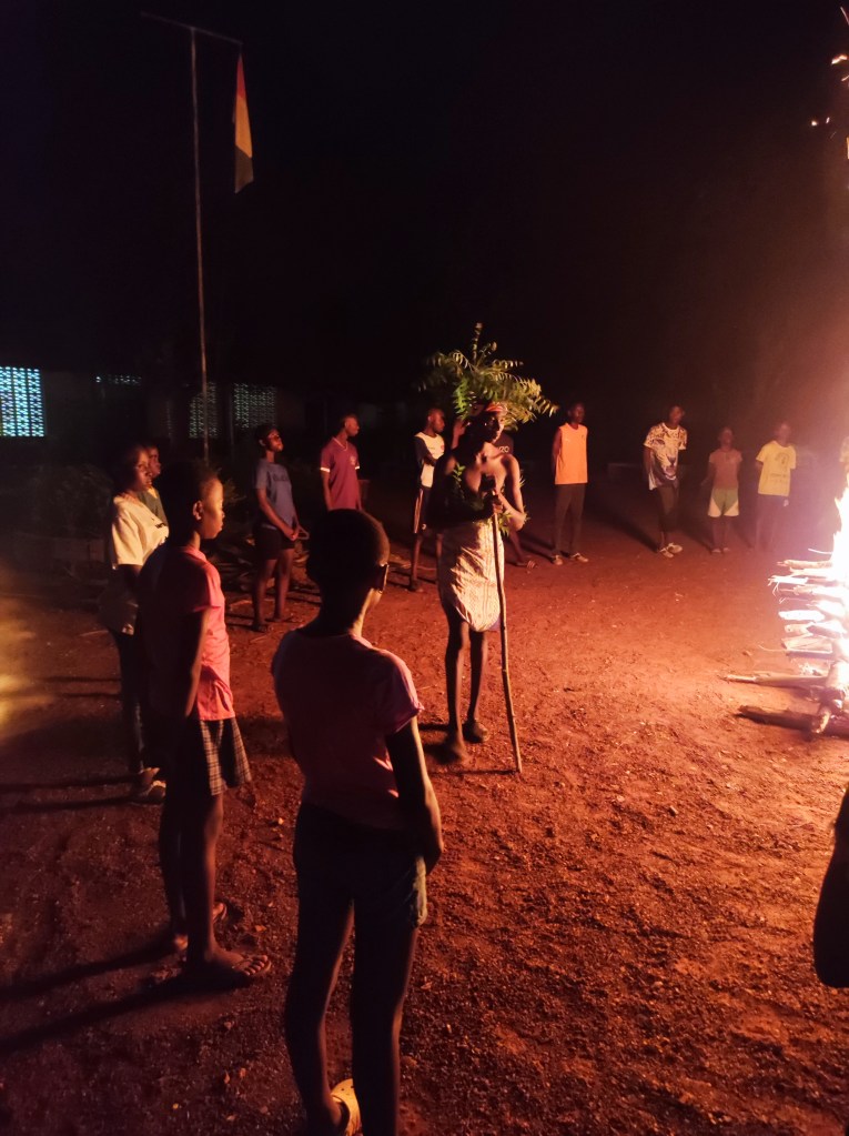 Fabrice, il responsabile del gruppo di Agnibilekrou, gestisce i movimenti e i tempi dell’accensione, mentre Alban, giovane animatore della parrocchia, anche lui scout, gira a torso nudo con delle foglie dell’albero di neem a circondargli la testa, aggiungendo e togliendo legna: è lui il guardiano. In mezzo alla pira sta un pilone centrale, posto perpendicolarmente al terreno. Gli scout mi spiegano che quel pilone si chiama “la regina” e che fino a quando resterà in piedi, nessuno del gruppo potrà allontanarsi dal fuoco. Fabrice spiega che questo fuoco ricorda quello che incendiò il palazzo di un re nel Benin. Questo re aveva una figlia generosa che continuò a donare anche dopo la sua morte improvvisa perché dalla sua tomba nacque della manioca, invece il re e la sua regina erano indifferenti e lontani dal loro popolo e morirono in un terribile incendio del palazzo. Dopo il primo momento più solenne è il tempo delle esibizioni e ogni gruppo ha preparato una piccola storia da raccontare agli altri, anche io mi esibisco in qualche pezzo di chitarra da cantare e danzare e i tamburi suonano senza sosta come solo in Africa. Ormai comincio ad essere davvero stanco, quando anche “la regina” cede: il pilone centrale è completamente consumato ed implode su se stesso lasciando me e gli altri scout liberi di ritirarsi nelle loro camere.