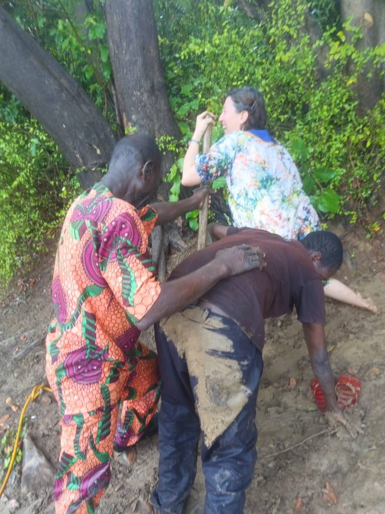 Dopo il pranzo siamo pronti a partire e siamo sottoposti a ritroso a una serie di visite ed incontri per poter domandare il permesso di lasciare il villaggio. Quando partiamo sono ormai le 14 ed il cielo è nero. Dopo poche centinaia di metri siamo in mezzo a un solenne temporale con tuoni e fulmini e in poco tempo il sentiero diventa un fiume. Quando finalmente attraversiamo la Comoé siamo ben fradici, ma ci preoccupa soprattutto la macchina. Infatti la strada già complicata ora è bagnata, ma ha smesso di piovere e proviamo a tornare comunque a Bangoua. Gli abitanti del villaggio promettono di aiutarci, ma effettivamente si unisce una squadra scalcinata composta dal vecchio catechista, un uomo chiaramente ubriaco, un adolescente poliomelitico e una squadra di bambini. Dopo pochi chilomentri ci troviamo bloccati e ci vuole del tempo per uscirne grazie anche all’aiuto e le spinte di qualche contadino. Quando finalmente ci sblocchiamo la strada peggiore è ormai alle spalle, ma la pioggia comincia a cadere copiosa e in poco ci ritroviamo bloccati nel fango. Ormai è tardi, sta quasi facendo buio, piove a dirotto e capisco che non riusciremo mai a sbloccare la macchina in quella situazione. Siamo a quasi due ore di cammino dal villaggio di Bangoua. Affidiamo Elisabetta ad un passante in moto e chiediamo di passare nell’accampamento accanto per informare della nostra situazione. Io e il catechista camminiamo sotto una pioggia insistente, quando finalmente qualcuno viene a trovarci e ci conduce in moto fino a Bangoua. Arrivati al villaggio sani e salvi scopro che la corrente è salatata proprio come ogni volta che c’è un po’ di pioggia. Nell’oscurità Elisabetta mi racconta che sulla strada del ritorno la moto è caduta e si è trovata a gambe all’aria in mezzo a una pozzanghera. Per fortuna non ci sono conseguenze e ce la ridiamo di gusto mentre ci domandiamo perché proprio oggi dovevamo pregare per la pioggia!