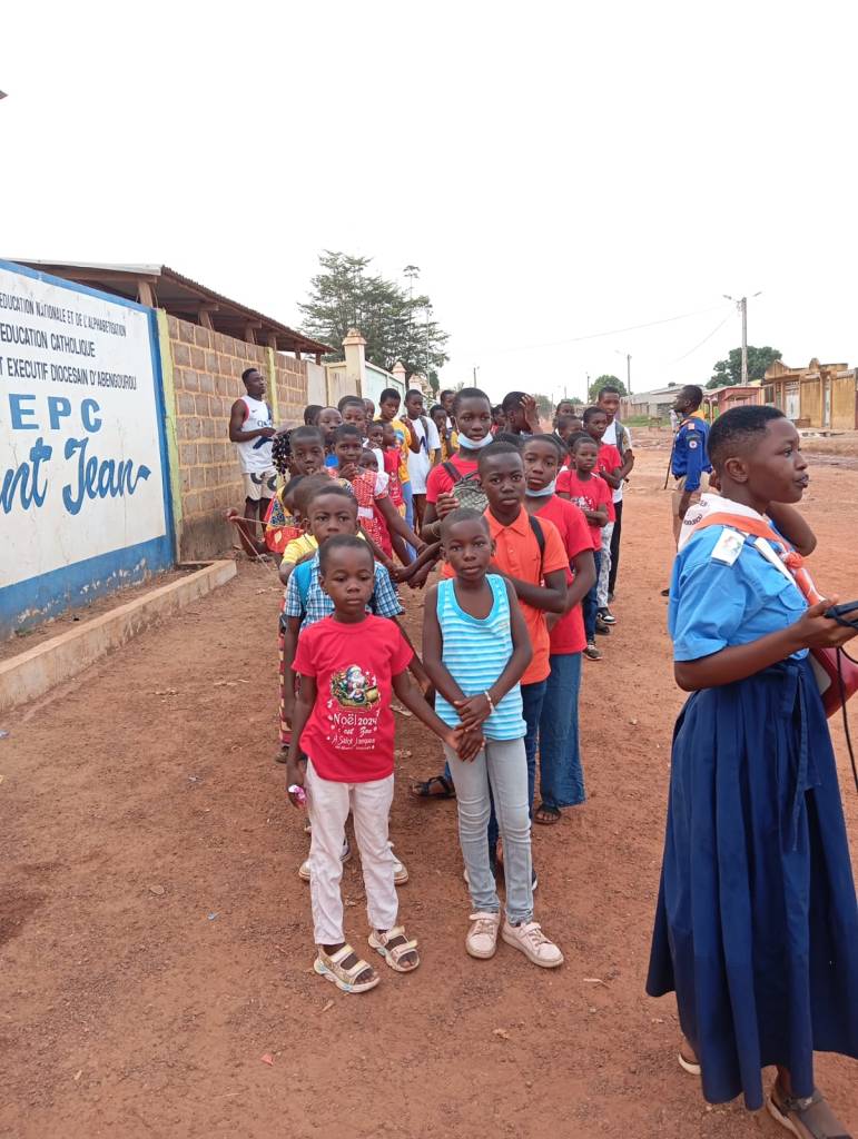 Finalmente è arrivato il momento, siamo nel cortile della scuola primaria della cattedrale di Abengourou, il caldo in questi primi giorni di marzo è soffocante: le prime piogge hanno fatto incredibilmente alzare il tasso d’umidità, ma non sono riuscite a smorzare la calura, e credo proprio che sia Dio a averci donato qualche nuvola che vela il cielo per impedire al sole di abbattersi impietosamente su di noi. Solo un’ora prima il cortile era vuoto, solo qualche operaio che sistemava l’altare e l’impianto audio, sempre all’ultimo minuto come da protocollo ivoriano ed io con qualche giovane cercavo di recuperare l’acqua in sacchetti da distribuire ai bambini. Da lontano si sentono i canti e i rumori di questa orda in arrivo. I bambini giungono in processione da sette differenti parrocchie della città di Abengourou e riempiono la grande città di colori, davanti alla cattedrale tutto è bloccato e sicuramente i nostri bimbi si sono fatti notare in tutta la città.