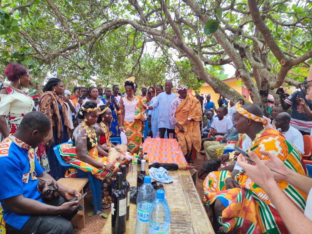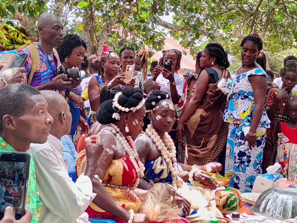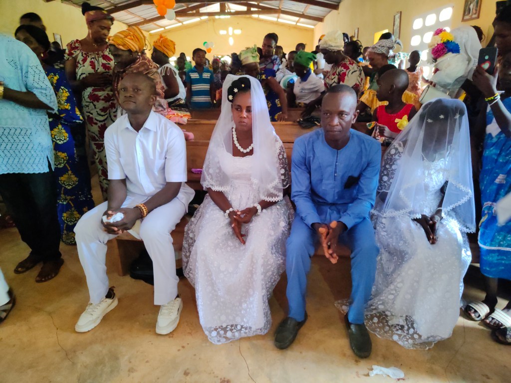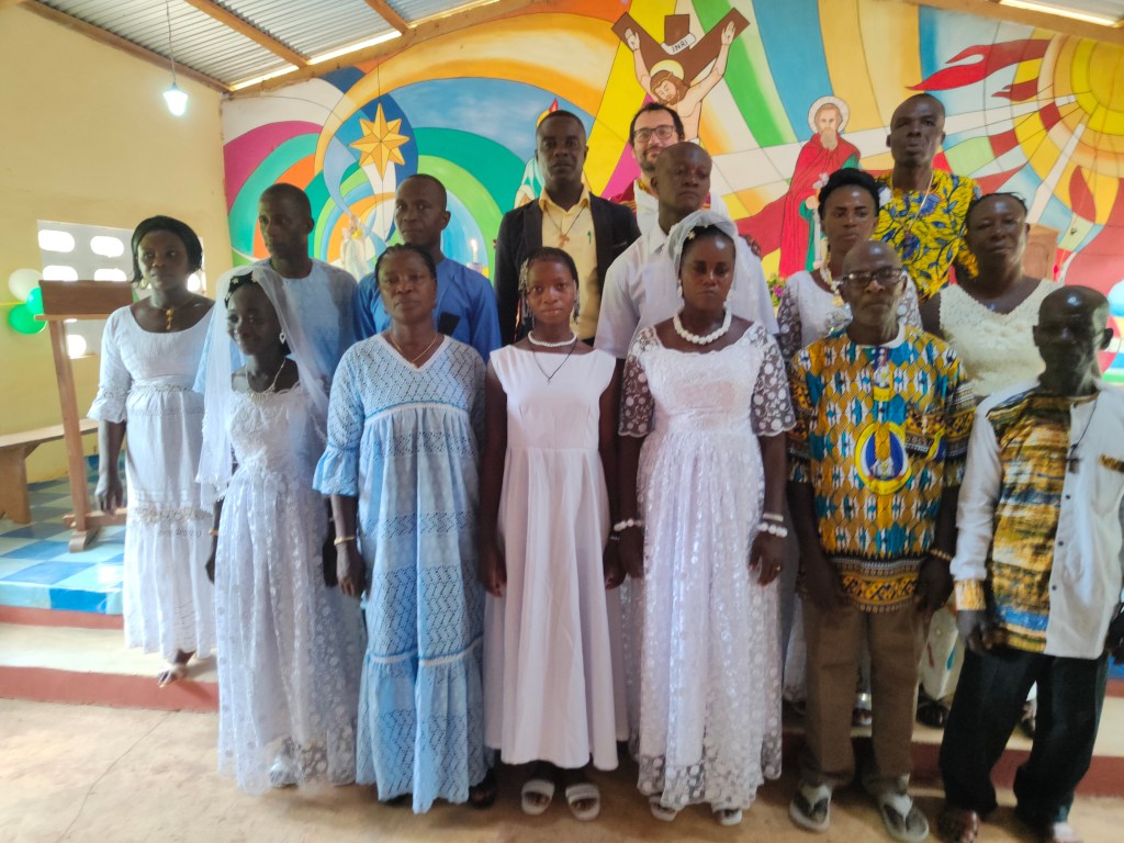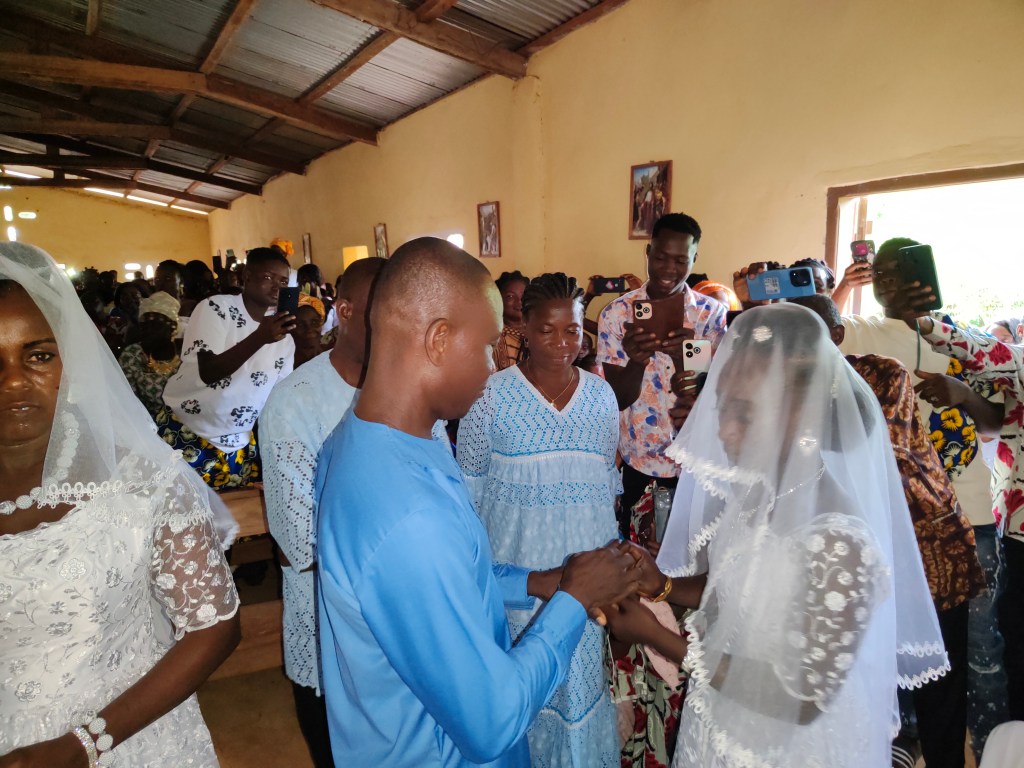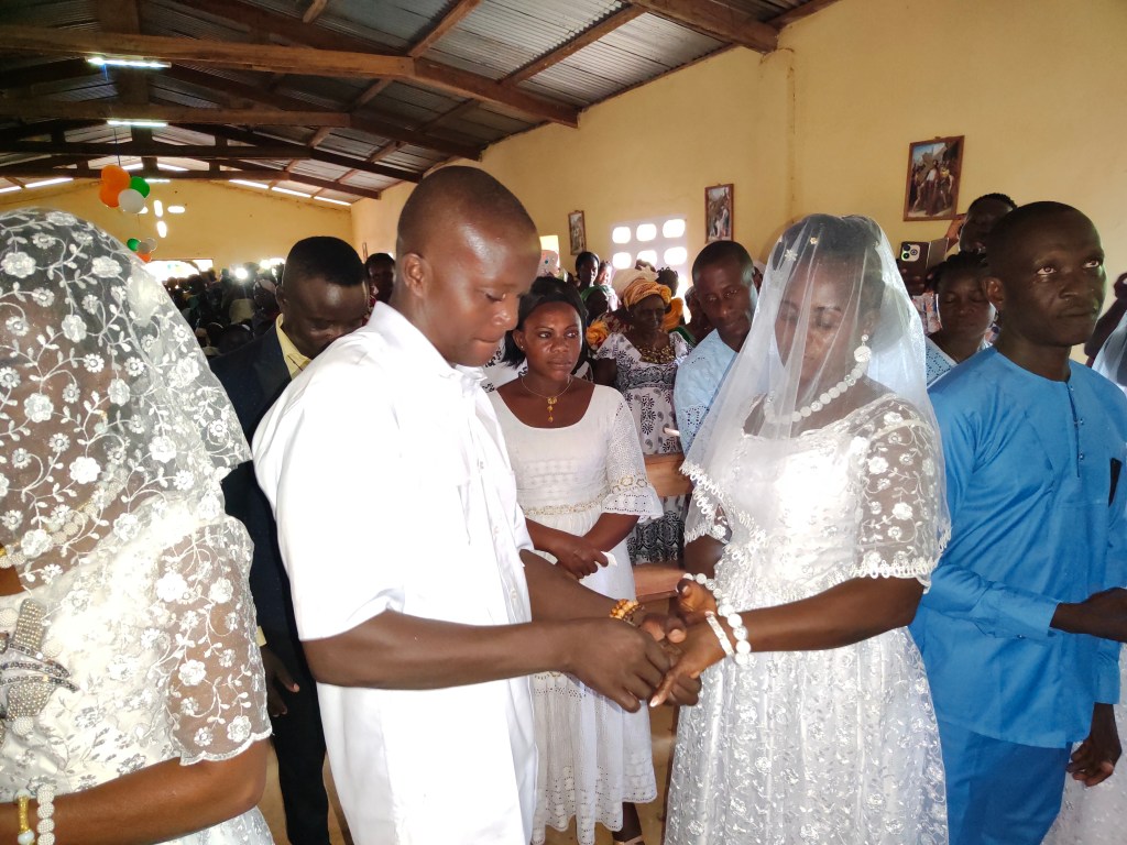 La domenica, durante la  cerimonia, la piccola cappella del villaggio di Kouassi Andrekro è gremita come non mai perché sono arrivati i cristiani da tutti i villaggi intorno e molti amici e parenti sono venuti da tutta la Costa d’Avorio. Gli sposi infatti non sono dell’etnia Agni, ma vengono dal nord e si sono trasferiti nel villaggio in cerca di terra da coltivare, quindi non pochi amici e parenti sono venuti dal loro paese d’origine. Una folla di curiosi filma incessantemente e senza troppo buon senso ogni momento della cerimonia, è il segno triste di una globalizzazione che porta anche nel villaggio senza corrente gli smartphone e che trasforma tutti il tiktoker! Tuttavia l’emozione è vera e forte e quando gli sposi rientrano dopo il loro battesimo danzano con grande gioia. Sono tutte persone semplici, alcune sono persone analfabete, ma oggi sono re e regine: è la dignità di essere figlio di Dio, non per i tuoi soldi, non per i tuoi titoli, non per i tuoi meriti, ma per grazia e dono. Dopo la cerimonia gli sposi salgono all’altare per firmare il registro, il vecchio Martin è un po’ impacciato, non vede a causa di una brutta cateratta e non sa dove firmare, più volte cerco di indirizzarlo e alla fine riesce a tracciare la sua tremolante croce al posto giusto. Quel segno che esprime il suo impegno di marito, è anche il segno di ogni cristiano, segno della fedeltà di Dio sempre.