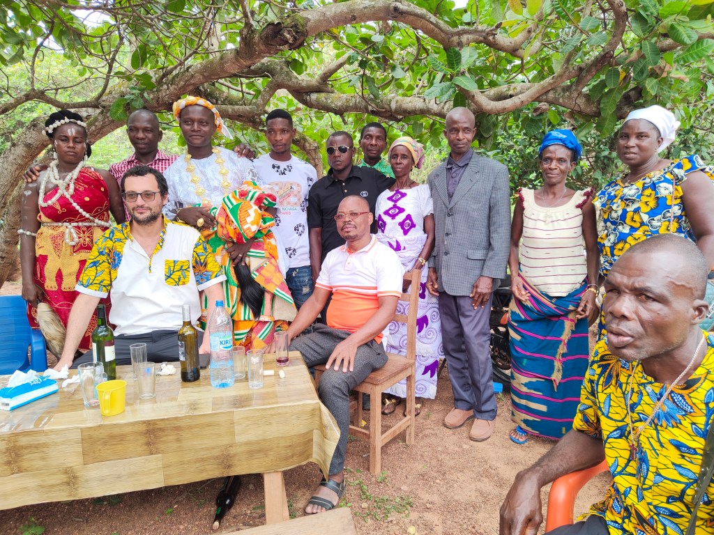 Ma François non è l’unico pellegrino dei nostri villaggi, nel piccolo abitato di Kouassi Andrekro, Albert è di ritorno giusto in tempo per un evento importante che aspettiamo da anni: il suo battesimo e il suo matrimonio! Albert è un catechista, uno dei più impegnati e bravi della parrocchia. Nel villaggio essere il catechista non si limita all’insegnamento della dottrina una volta a settimana. Il catechista fa le veci del prete e presiede la liturgia della parola, leggendo il Vangelo e predicando. Albert anima la corale e il gruppo dei giovani, si prodiga nell’organizzazione delle feste ed è davvero il motore di questa comunità. Purtroppo non era ancora battezzato. Albert in effetti ha seguito il percorso di catechesi da adulto, come molti in Costa d’Avorio, ma finito la formazione non ha potuto celebrare il suo battesimo perché convivente con la sua donna. La paura di un passo importante come quello del matrimonio cristiano ha fatto procrastinare per anni il battesimo di Albert che frequentava la Chiesa, animava la liturgia, senza però essere battezzato: paradosso delle terre missionarie. Finalmente ha accettato di sposare sua moglie con cui ha quattro figli ormai grandi. Ma non è solo, anche Alexis, l’altro catechista celebra il suo matrimonio con Solange, l’animatrice delle ragazze che danzano in chiesa, e pure Clarisse con Martin, un anziano signore praticamente ormai cieco che durante la cerimonia sembra particolarmente spaesato e infine una adolescente sarà battezzata.