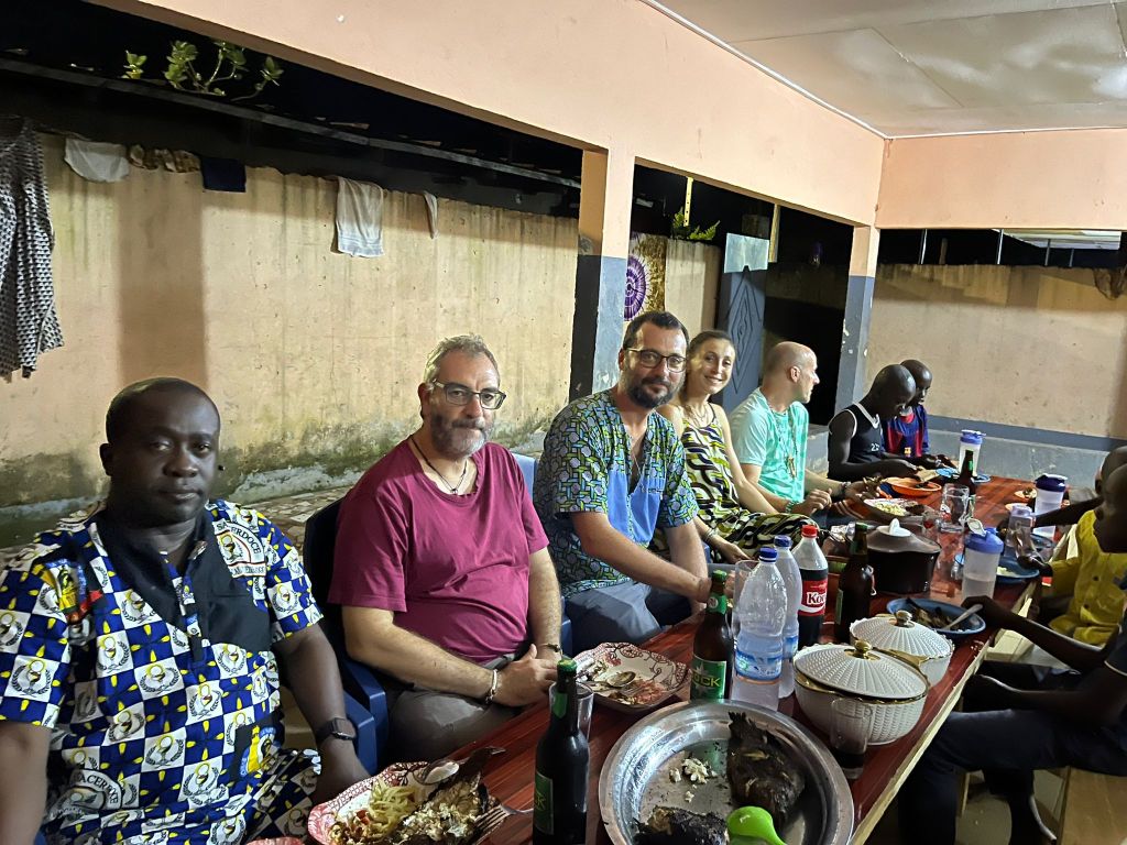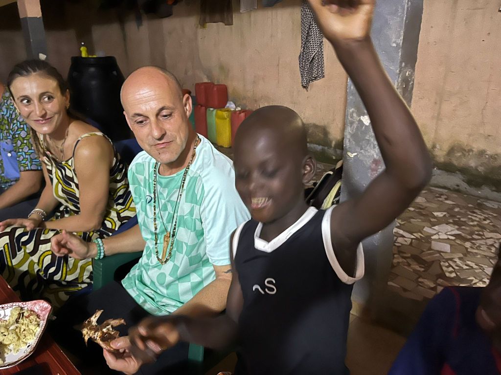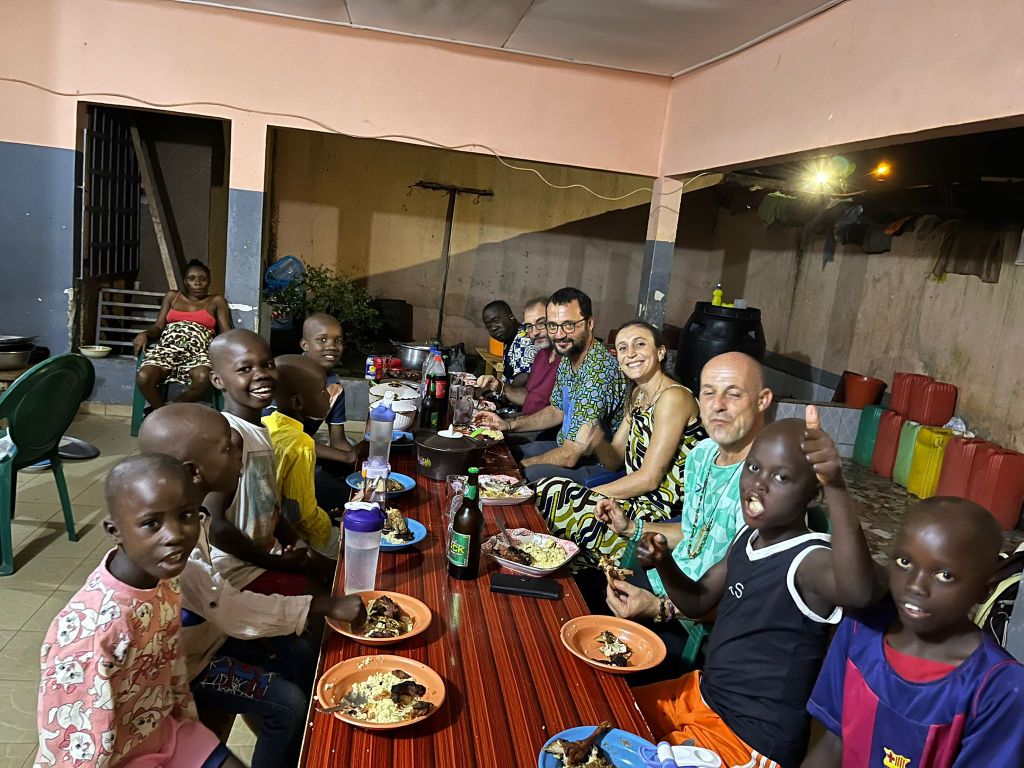 Ma stasera, malgrado tutto si esce a poche centinaia di metri dalla parrocchia dove da un paio d’anni sorge un piccolo orfanotrofio gestito da un ong locale. La presidente dell’organizzazione si chiama Marie Louise ed è davvero una mamma Africa. Il volto sereno e disteso, il sorriso sempre accogliente e il fisico statuario, quando Malù (così si fa chiamare) ti viene incontro e ti abbraccia subito ti senti accolto dalla sua morbida presenza e sicurezza. Da alcuni anni ha cominciato a accogliere casi sociali nella sua casa, bimbi abbandonati dai genitori o bimbi gravemente trascurati che il servizio sociale le ha affidato. Oggi tutti noi missionari siamo invitati speciali da loro. I bimbi ci accolgono con un abbraccio caloroso e poi i più grandi cominciano a sistemare la tavola e a richiamare i più piccoli. Non sono molti bambini, ma tutto è pulito e ben organizzato e si respira clima di casa. Malù ha preparato dell’ottimo pesce alla griglia e del pollo con dell’attieké e con la banana fritta e non ci si può tirare indietro davanti a tutto questo ben di Dio. Oggi si festeggia un evento particolare, il ministero della protezione del bambino ha riconosciuto ufficialmente l’orfanotrofio che ormai può operare con l’appoggio dello stato ivoriano. Non credo che a livello economico ci sia un grande sostegno, ma c’è la soddisfazione di aver adempiuto a certe regole, di aver lavorato e che il lavoro sia ormai ufficialmente riconosciuto.